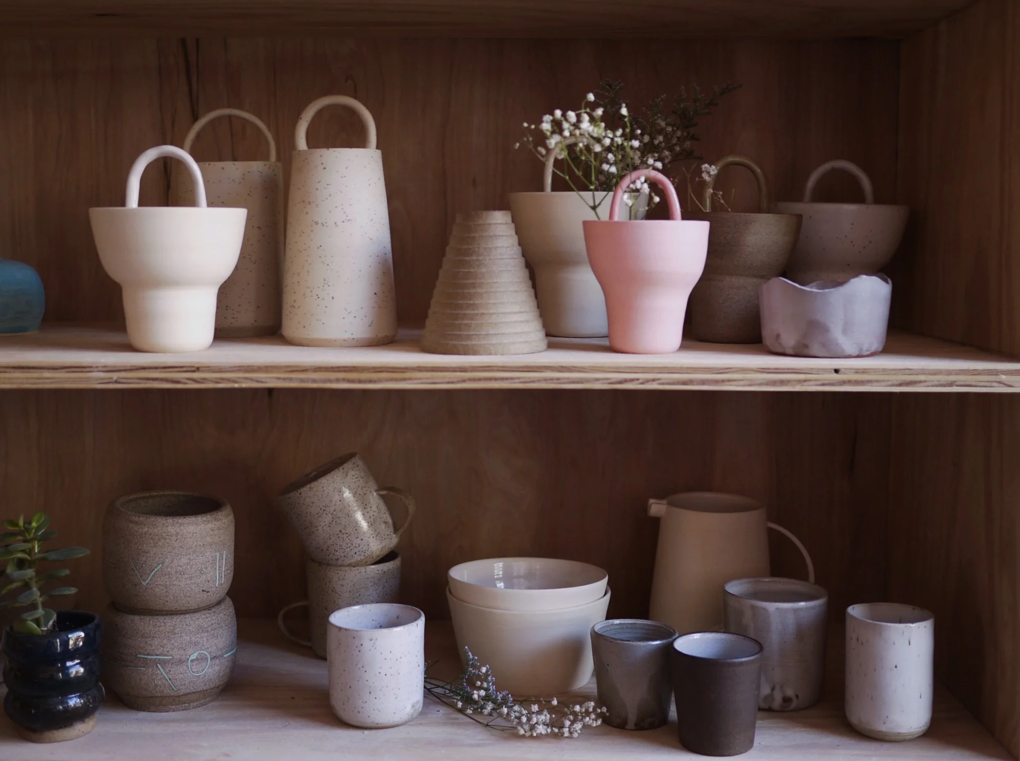 Assorted vases, and assorted tableware. On the bottom left of the image is one of my first pots ever- the dark donuts planter.