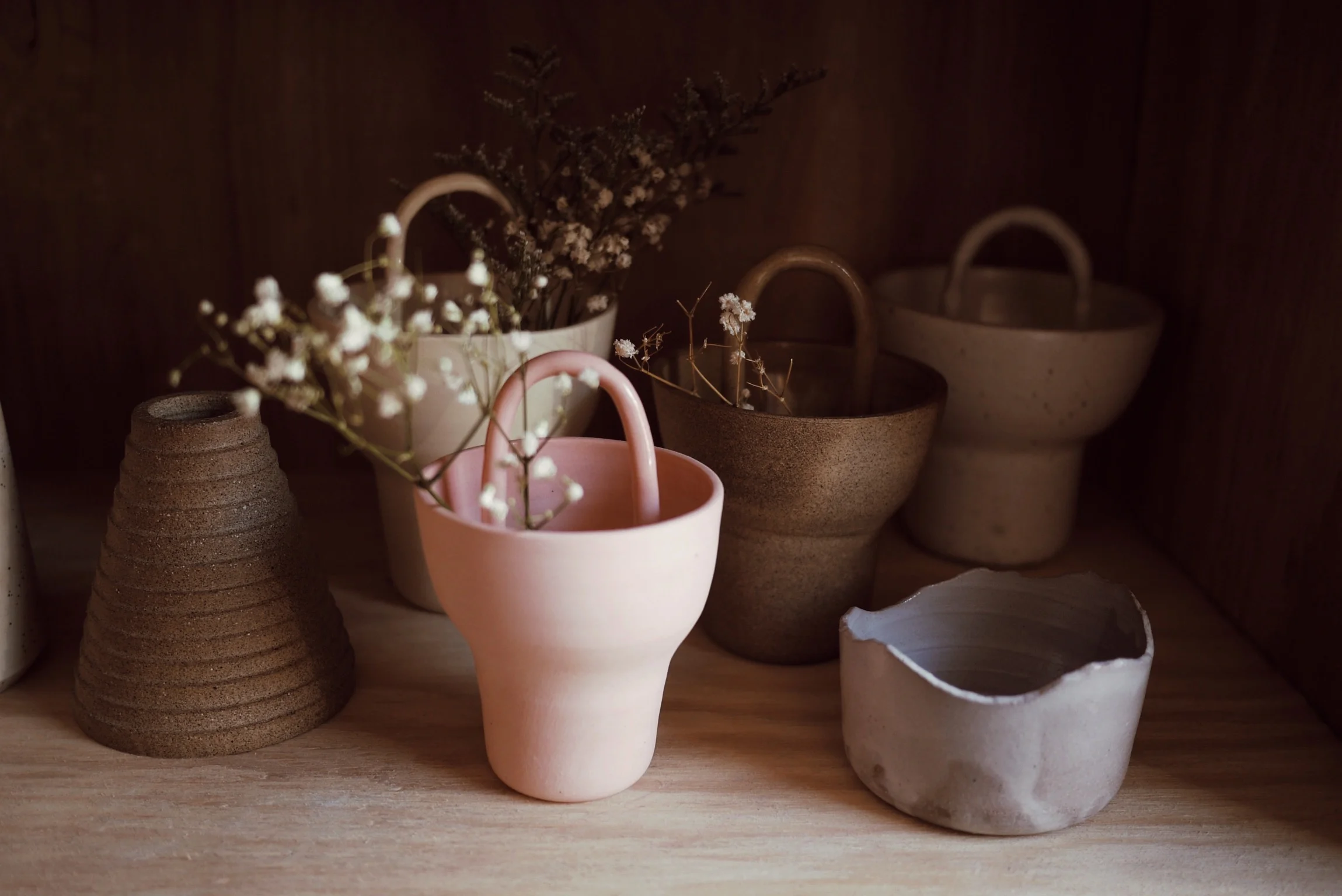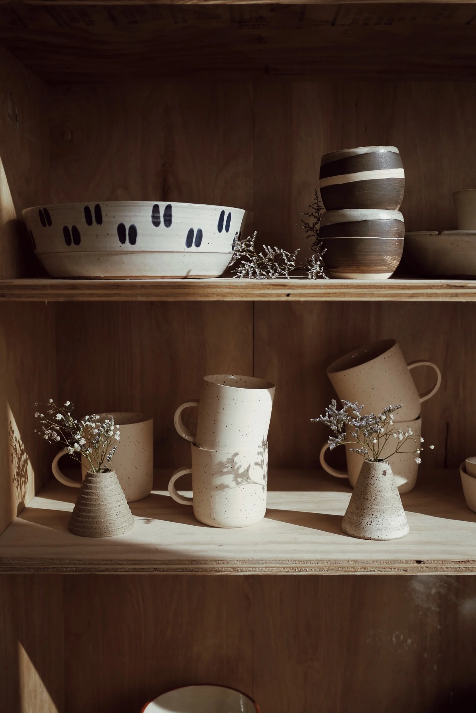 Some dramatic little flowers casting shadows onto my speckled mugs, with more of Renee's tableware above.