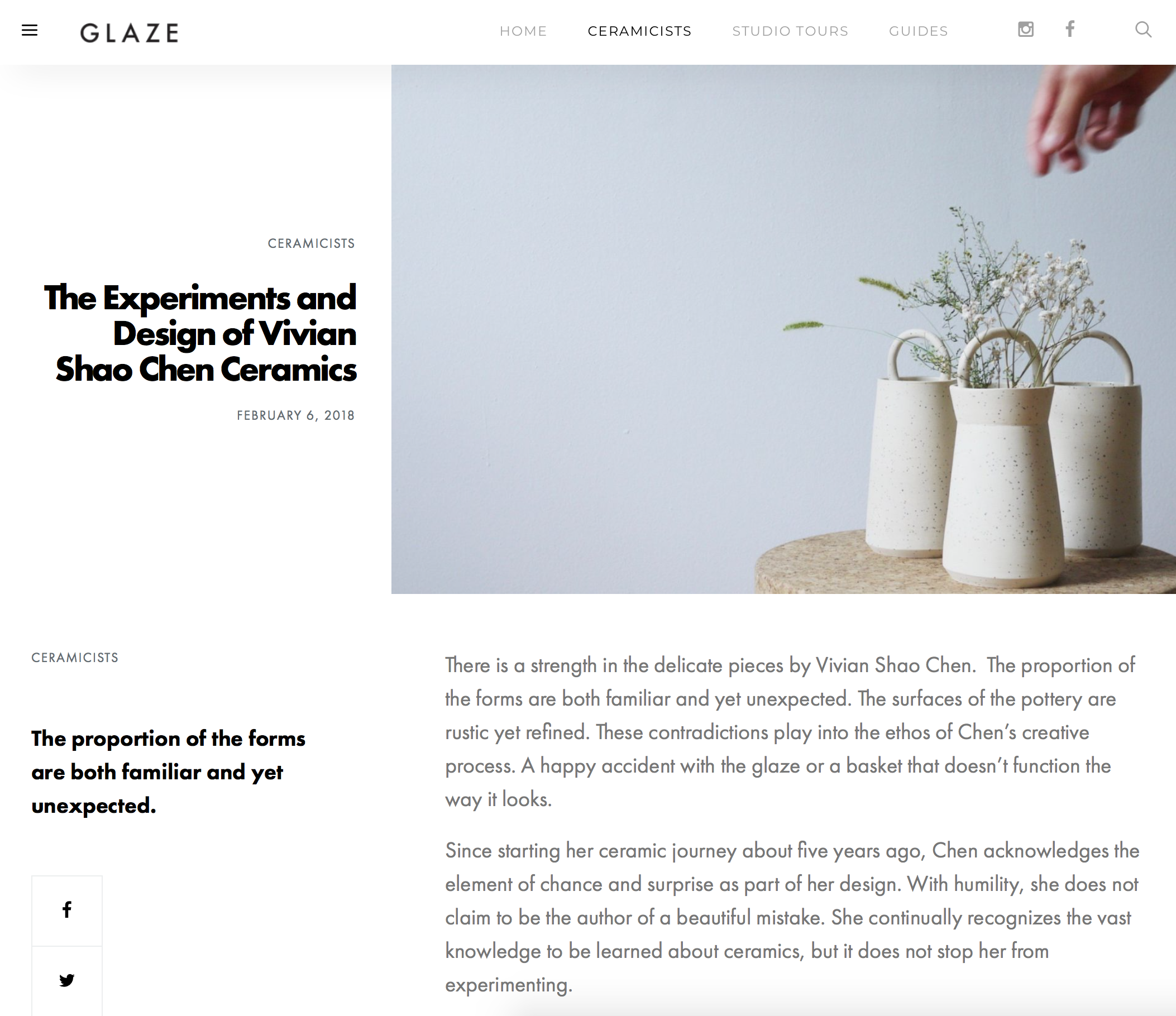I am so pleased to be featured on Glaze Magazine in their ceramicist profiles. If you don't already know about it, Glaze is an online journal about contemporary ceramics. Check it out here! Thank you, Glaze, for the kind and generous words. I'm humbled and happy to be placed in the same space as other ceramicists that I've admired for so long.